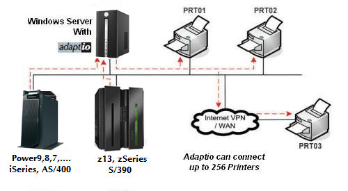 Adaptio offers the flexibility, speed, and control expected by IBM users. As the requirement for host printers increases, additional printer sessions can be added. With expandability in mind, Adaptio starts by supporting 1 network attached printer, and expands to support up to 256 printers. When printing from an IBM iSeries, AS/400, zSeries or System S/390, Adaptio prints IPDS and SCS print jobs at speeds up to 250 pages per minute. Adaptio provides bi-directional communications between the IBM host and the printer, preventing documents from being lost in the 'black hole' of network printing. In addition page range printing is supported.